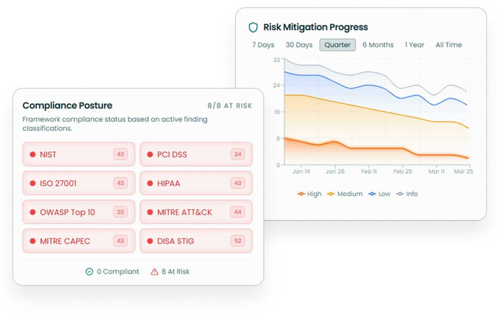 - Maps validated vulnerabilities and findings to major compliance frameworks, standards, and security taxonomies using AI-driven analysis.